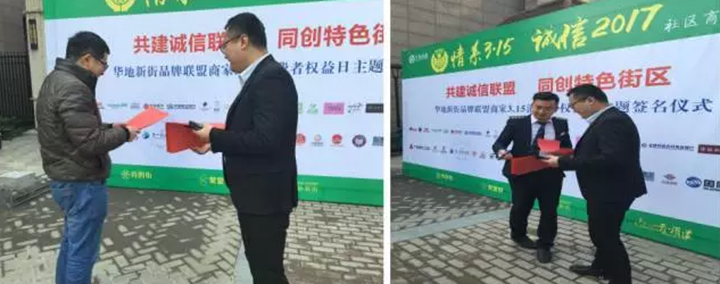 2017年3月15日,“華地新街品牌聯(lián)盟商家3·15消費(fèi)者權(quán)益日”主題簽名儀式在華地新街隆重舉行。上午10時,各商戶代表齊聚在品牌墻下,由商業(yè)公司工作人員向大家宣讀并發(fā)放《倡議書》,各商戶代表在品牌墻上鄭重簽名,為共建誠信聯(lián)盟,共創(chuàng)特色街區(qū)而簽下鄭重的承諾。