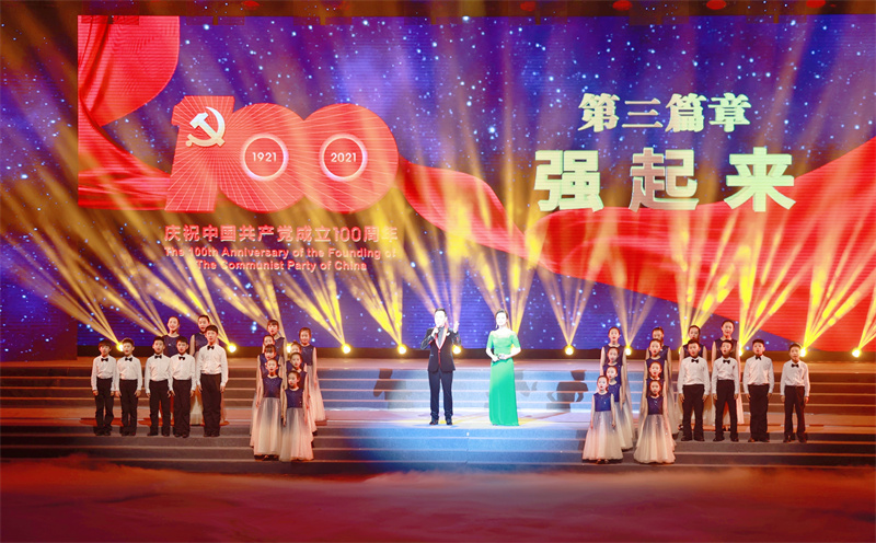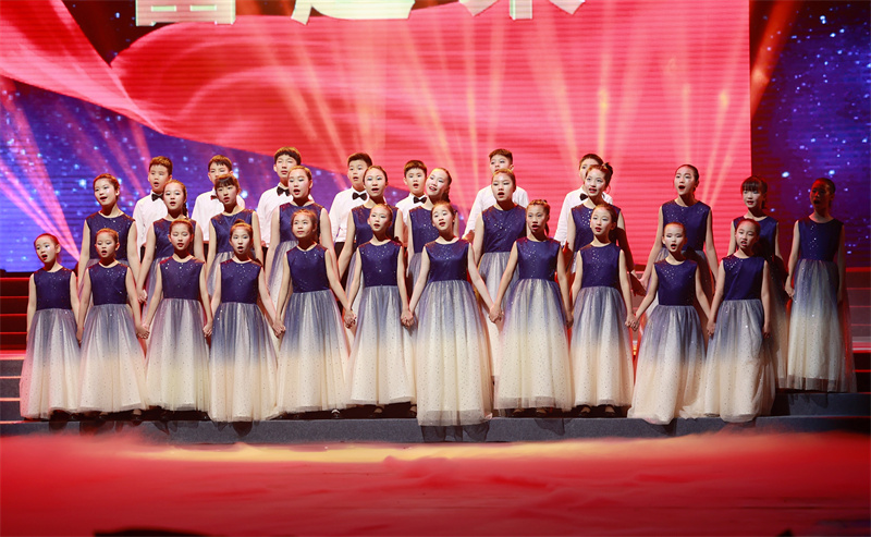 新華公學童聲合唱團完美的用哼鳴式演唱法為晚會三個篇章開場,用歌聲向中國共產黨百年華誕獻禮,用微笑和行動表明作為社會主義接班人的決心:“童心向黨,堅決跟黨走,聽從黨的指揮”。