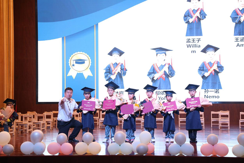 張寧校長、溫晨瑋校長和萬毅園長為大班的孩子們頒發(fā)畢業(yè)證書。